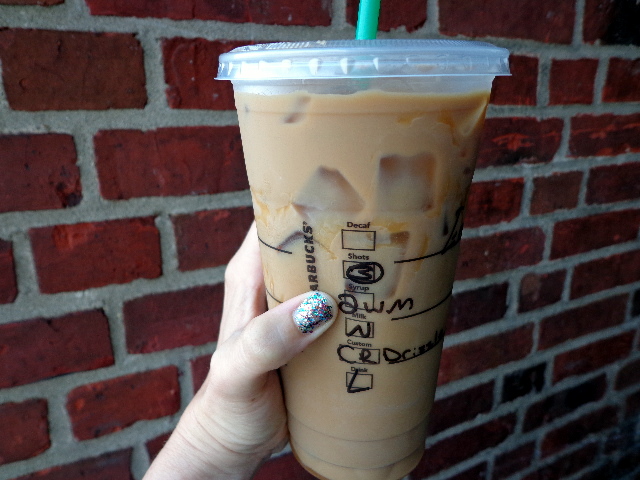 Venti iced skim latte with an extra shot of espresso, 2 shots of white mocha, and caramel drizzle. I was buzzing.