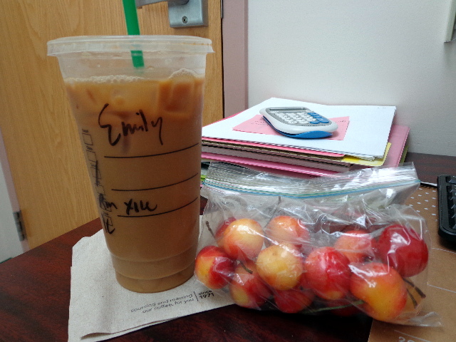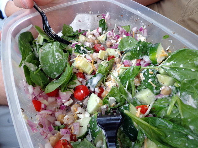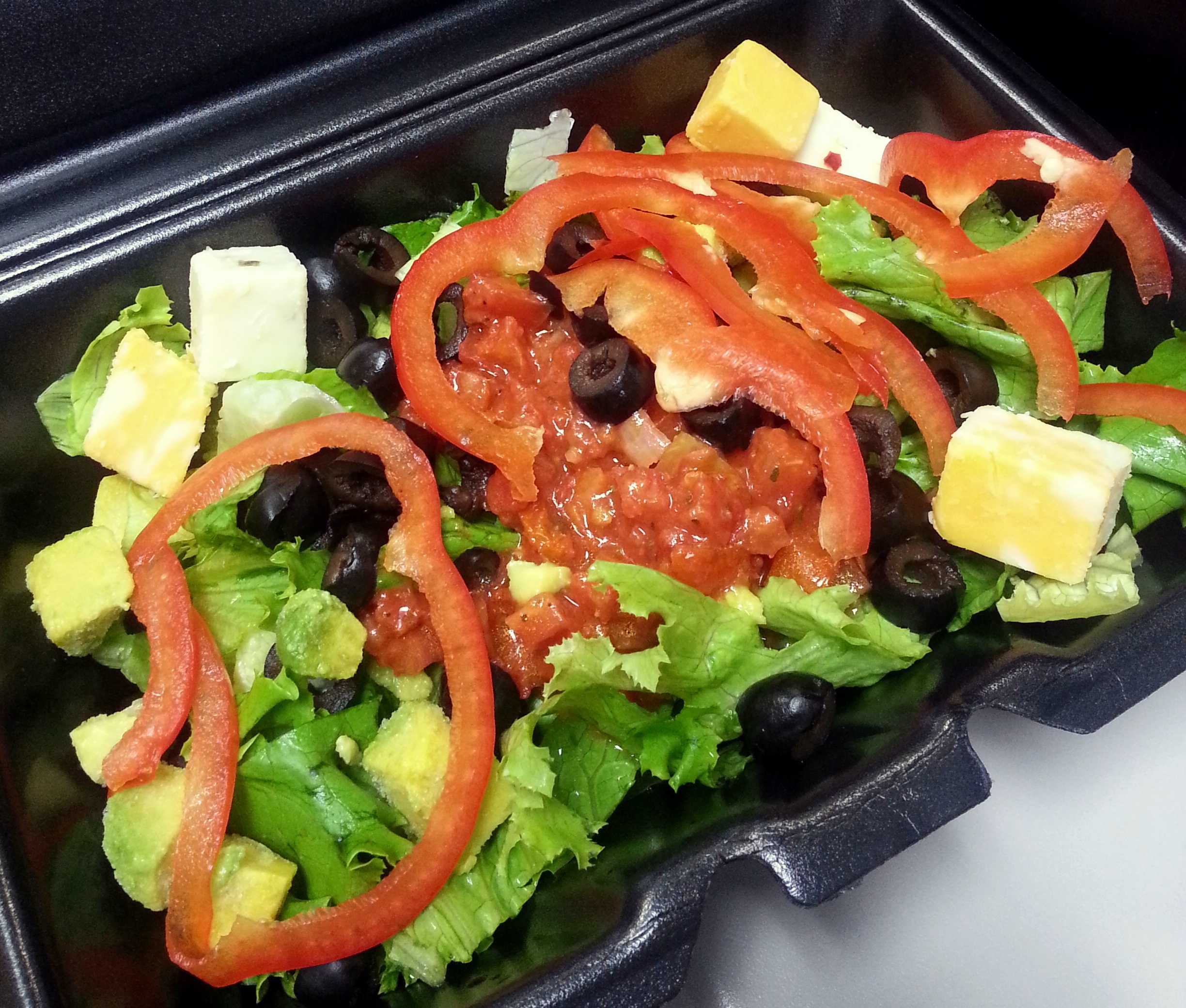 On the only non-yogurt day, I made myself a “taco salad” from the cafeteria. Romaine with black olives, red peppers, cheddar and pepperjack cheese cubes, avocado, and tons of salsa.