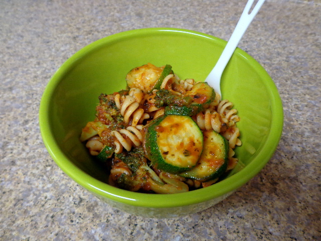 Whole-wheat rotini with broccoli, roasted zucchini, and tons of marinara sauce.