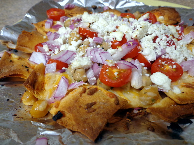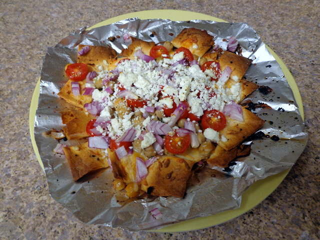 Greek nachos! I baked pita chips topped with three-cheese blend, crumbled fat-free feta, tomato, red, onion, and chickpeas that I tossed with lemon juice, evoo, and oregano.