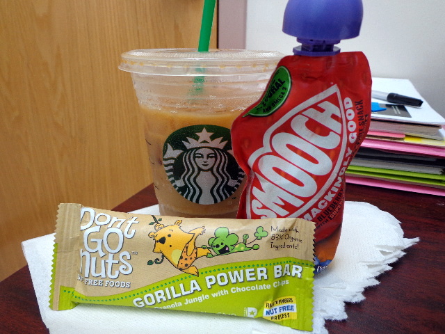 Coffee, Strawberry/Blueberry/Banana SMOOCH {UB}, and a Don’t Go Nuts Gorilla Power Bar.