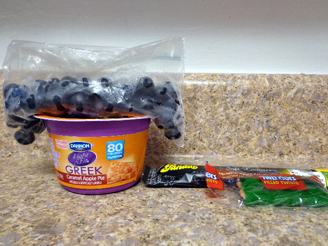 {2} The most on-theme lunch. Blueberries and caramel apple pie Greek yogurt, plus licorice and caramel apple Twizzlers for later.