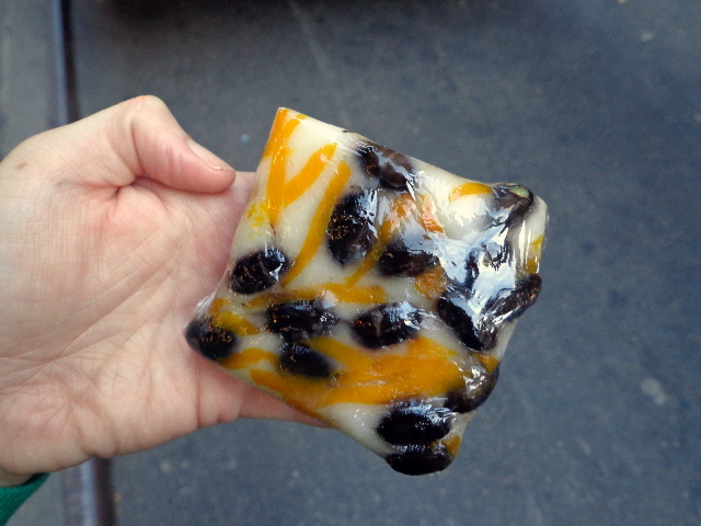 The top is mango and red bean but we couldn’t identify the white – chewy and gelatinous – stuff.  Neither of us could bring ourselves to swallow it!
