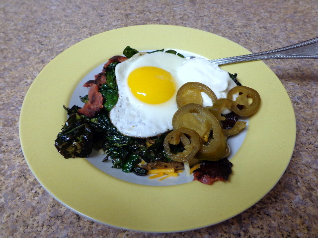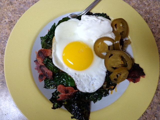 I swear that there is a potato under there.  Topped with butter, sharp cheddar, turkey bacon, leftover kale salad, jalopeño, sour cream, and a fried egg.