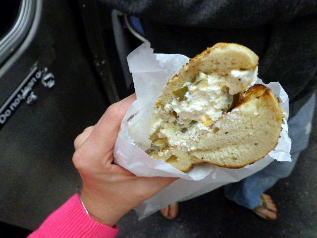 Train fuel = toasted everything bagel with jalopeño-cheddar cream cheese.