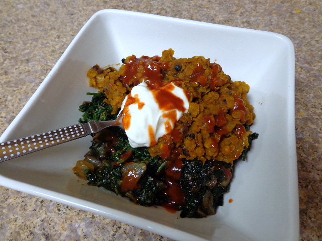 Sprouted red jasmine rice // frozen spinach sautéed with bbq sauce, browned mushrooms and tons of onions // red lentils cooked with cumin, turmeric, smoked paprika, curry powder, and more sautéed onion // sour cream and Sriracha on top.