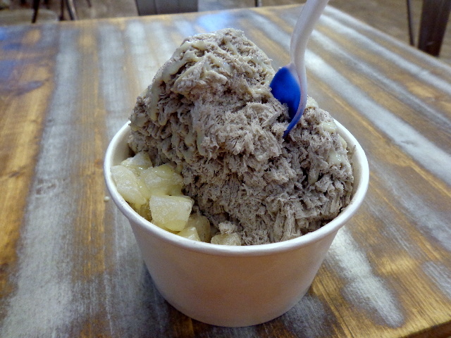 Roasted black sesame ice with mochi and sweetened condensed milk. It was amazing. The ice is sliced into sheets rather than crushed and the texture is totally unique.
