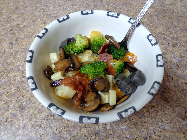 Pasta with roasted broccoli, browned mushrooms, rock cheddar, fancy evoo, and turkey bacon (my new favorite kind, from Wellshire).