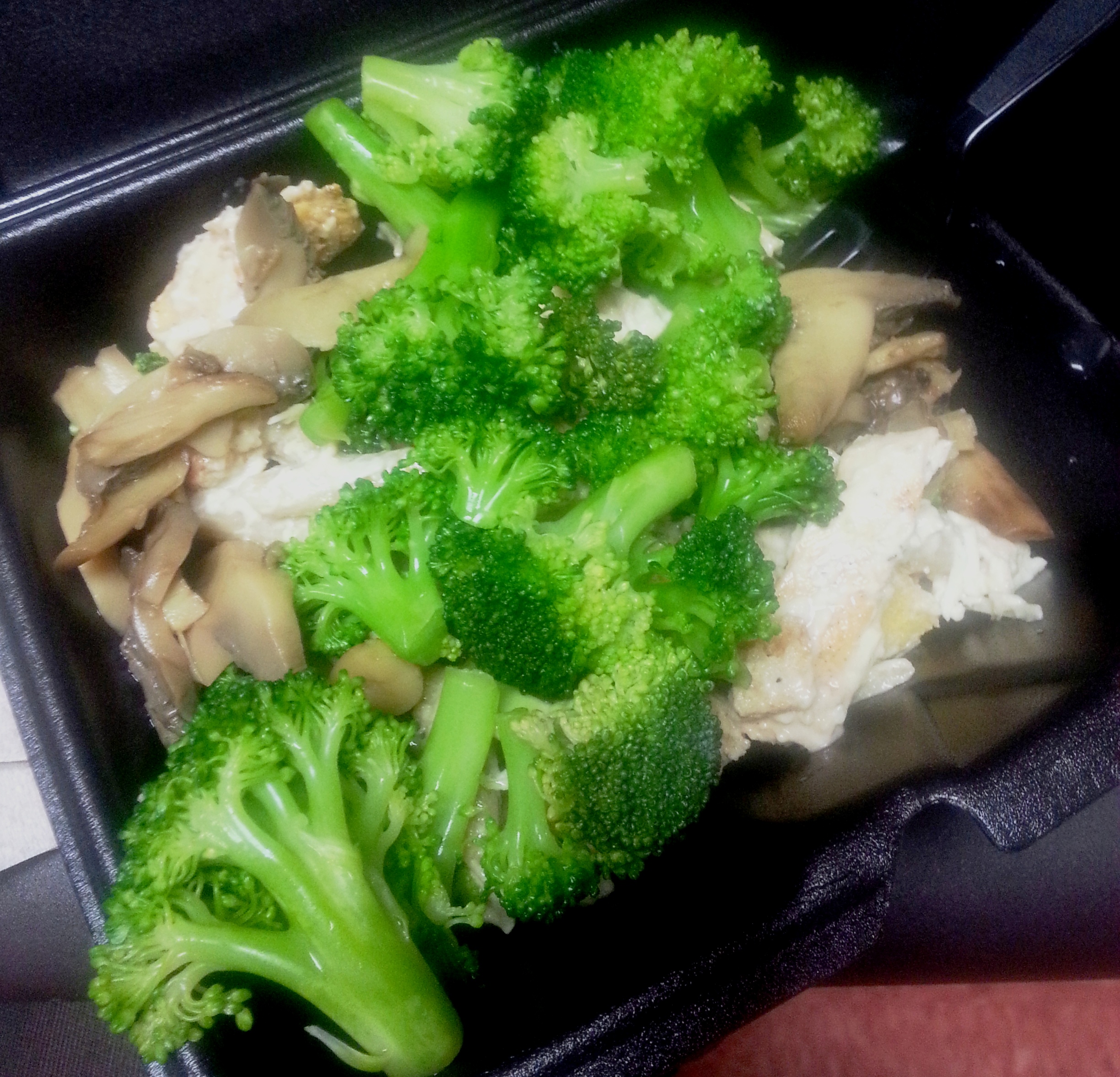 A strange Caesar pasta salad (it was chicken and dressing with pasta AND croutons?!) topped with mushrooms and broccoli from the salad bar.