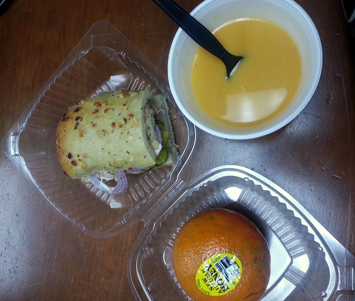 Tuna salad sandwich, lobster bisque, and a honey tangerine from home.