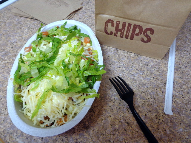 White rice, pinto beans, veggies, corn and mild salsas, cheese, sour cream, and lettuce.