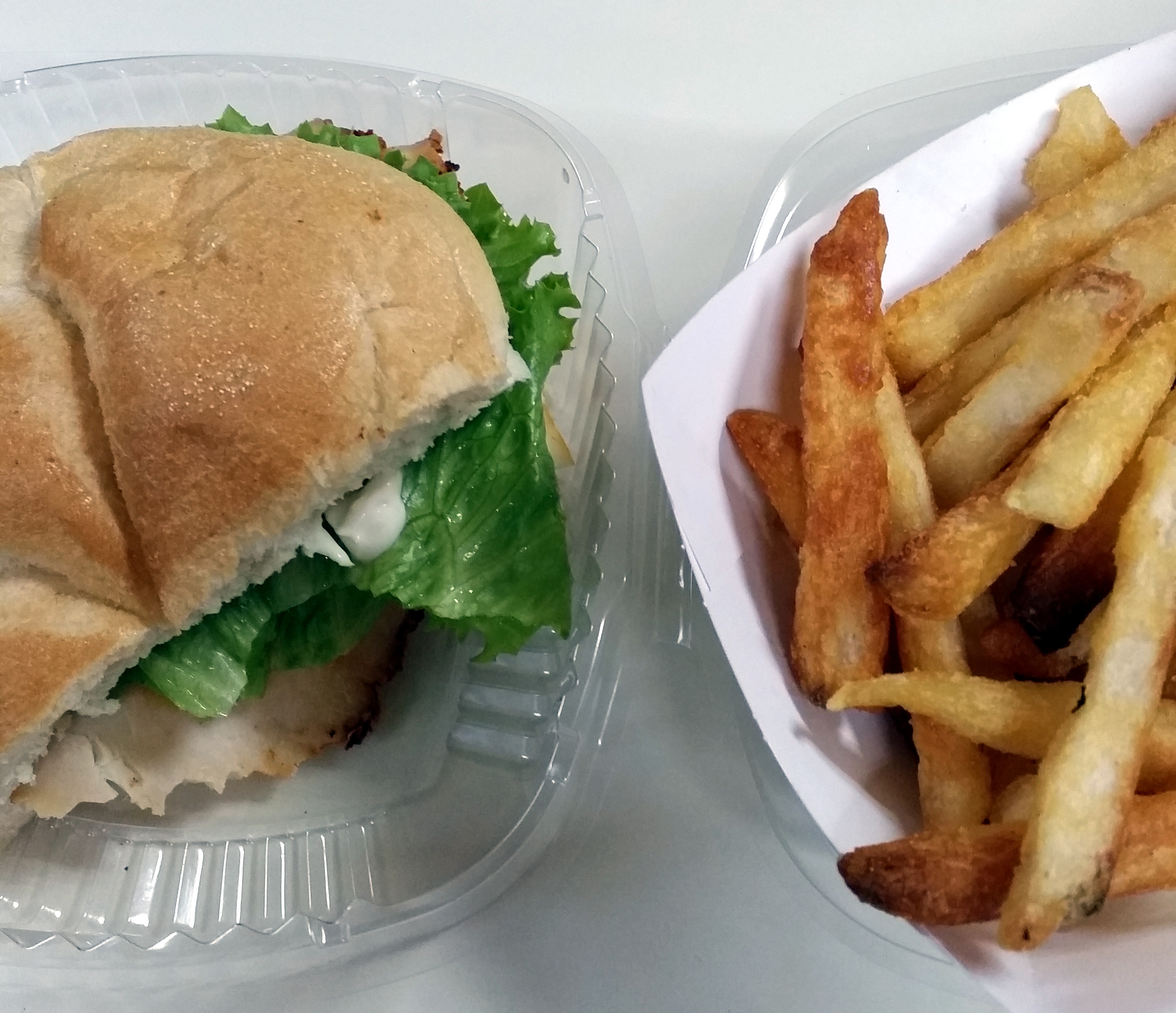 From the cafeteria – a turkey sandwich and baked fries.