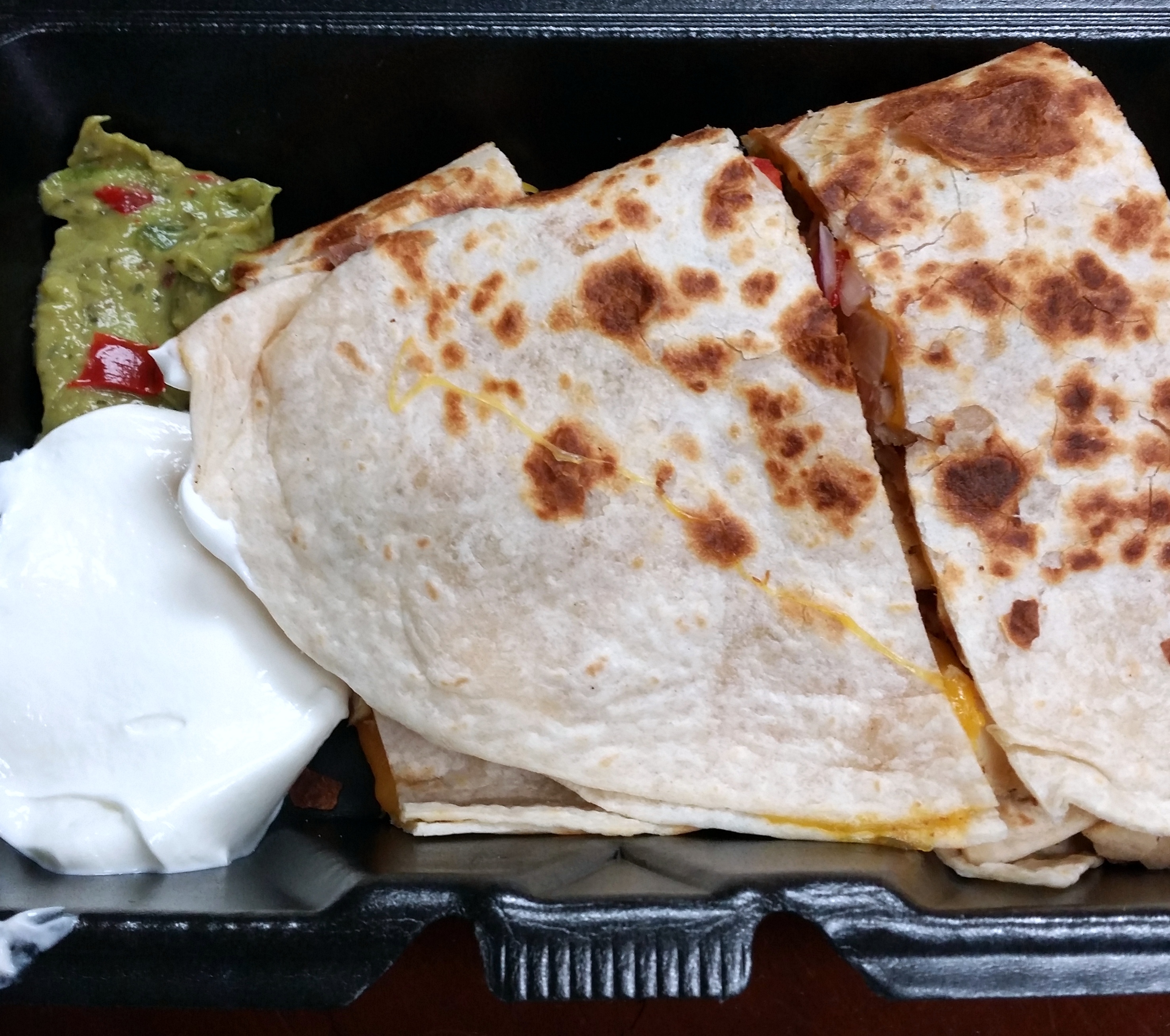 With cheese, chopped bell peppers, and sour cream and guacamole on the side. I planned on only eating half because it was quite big, but it was so good I ended up demolishing the whole thing.