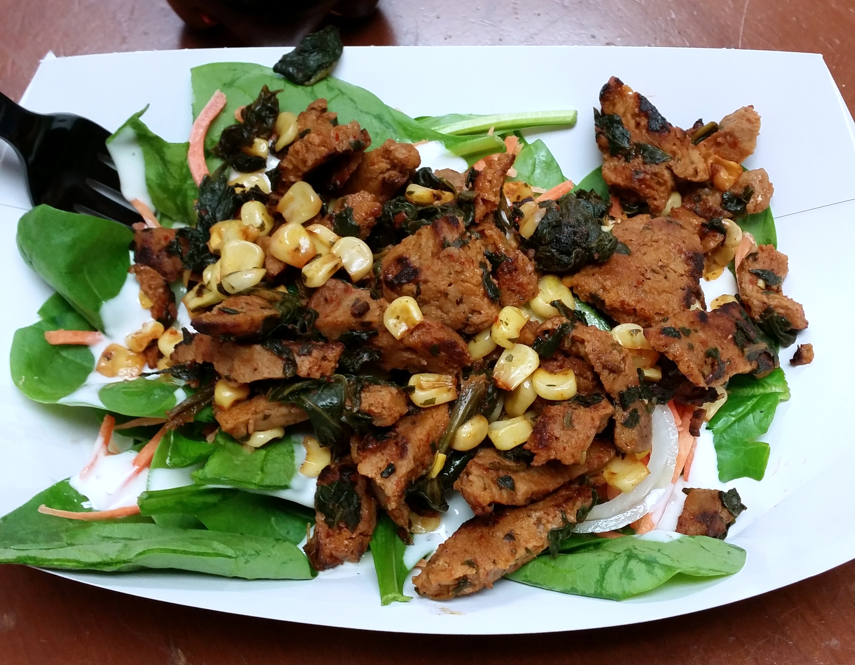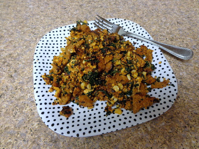 I guess the next day was pretty similar as well. I sautéed chopped seitan, corn, and spinach in evoo and Sriracha and then scrambled in eggs and part-skim mozzarella.