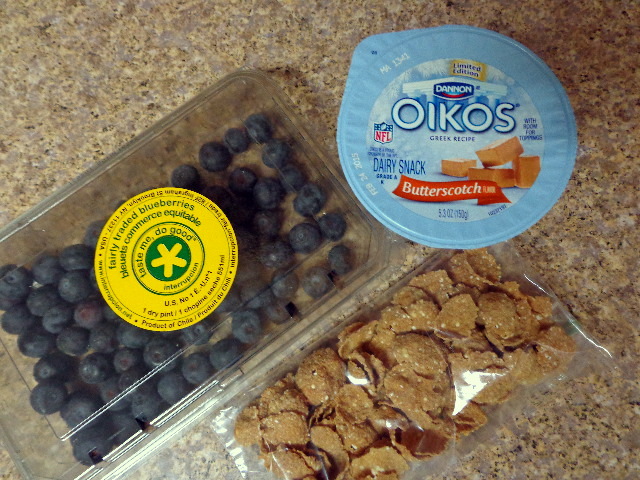 Blueberries, Heritage Flakes, and a Dannon butterscotch Greek yogurt.