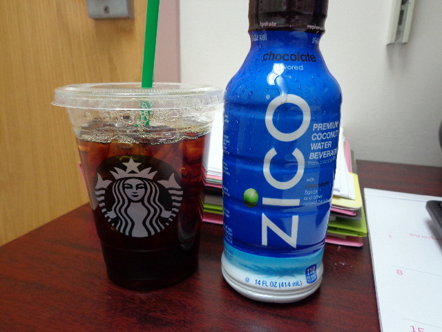 Coffee and a chocolate coconut water.
