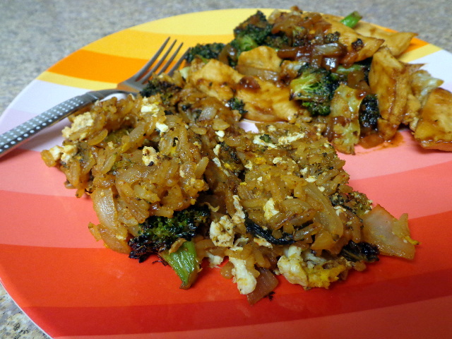 Leftover rice and veggies stir-fried with sautéed onion, eggs, fish sauce, soy sauce, and rice vinegar.