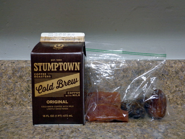Stumptown cold-brew box with turkey jerky and dates.