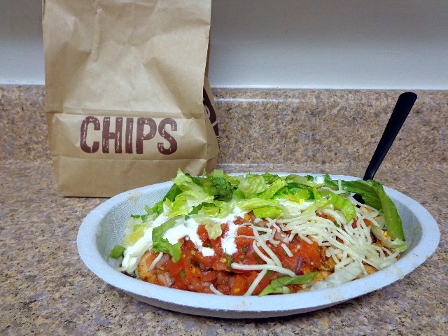 Chicken rice bowl with sautéed veggies, three types of salsa, cheese, sour cream, and lettuce. Plus chips. There’s a giant diet coke just to the right of that photo ❤