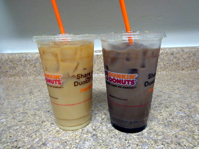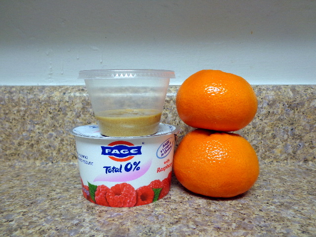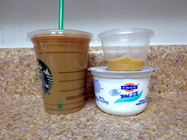 Iced coffee on the train and plain yogurt with peanut butter at my desk.