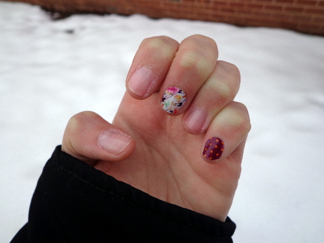 One of the girls I used to cocktail waitress with is a Jamberry consultant (her sales page is what I linked above) and she sent me a sample kit so I could try them out.  I am pretty amazed by how easy they are to put on; really not tricky or time-consuming at all, maybe almost as easy as slopping painting on polish.  Plus they are very cute!  I will definitely buy some to try again.