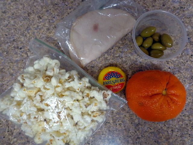 Popcorn, Applegate Farm sliced turkey, mini Jarlsberg, and olives.