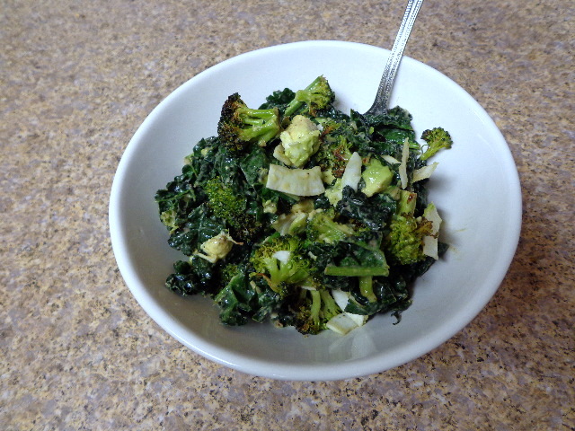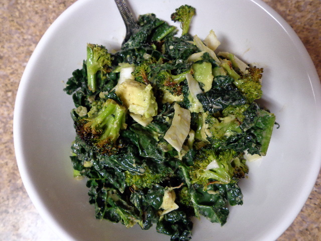 I massaged a bunch of kale with Sepo sauce in the morning and then tossed it with roasted broccoli, cubed avocado, and roasted coconut chips when it was time for dinner.