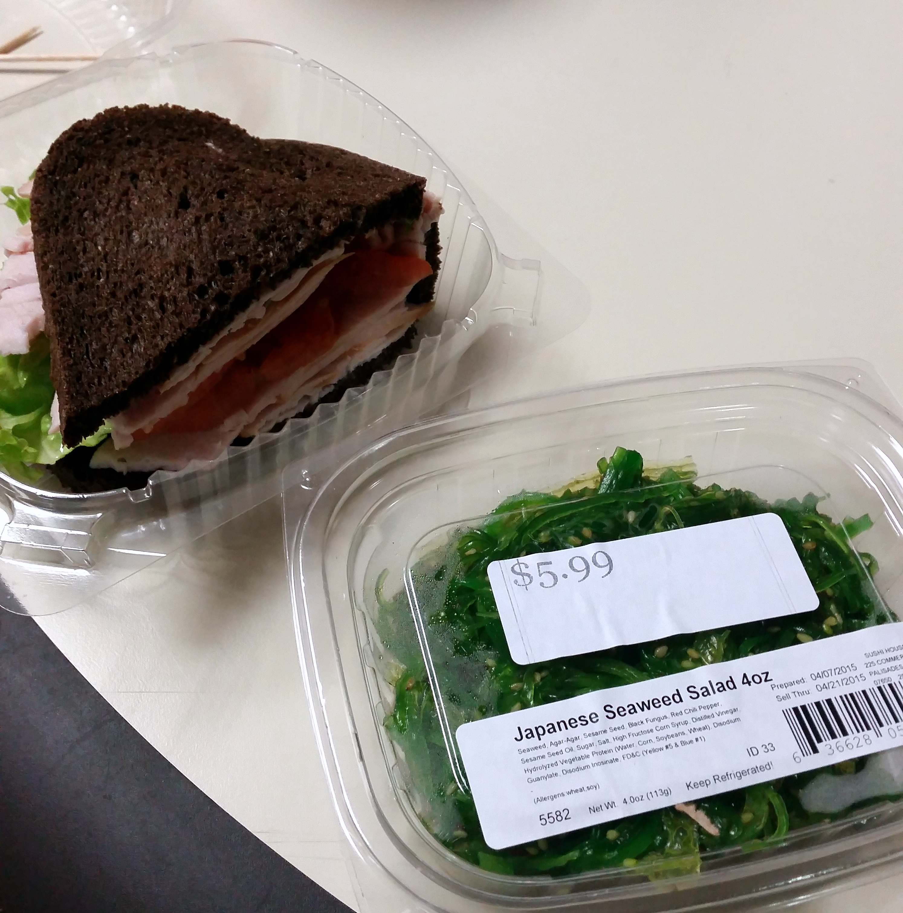 A half turkey sandwich from the cafeteria with seaweed salad and Easter candy delivered by a coworker.