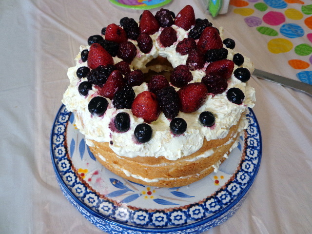 Dessert was angel food cake layered with a yummy Cool Whip + vanilla pudding mix + shredded pineapple concoction.