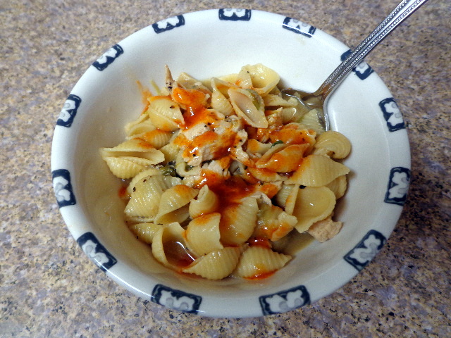An easy, amazing soup. I cooked shell pasta in chicken broth then dumped in sautéed chopped bok choy and green onions, shredded cooked chicken breast, and a sprinkle of salt and pepper. My bowl was drizzled with sweet chili oil as well. Adam absolutely raved about this dish.