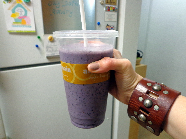 Smoothie #2 – blueberry bliss. Frozen blueberries and dates with plain almond milk, plain Greek yogurt, and a little honey.