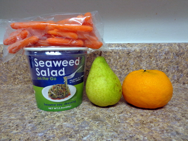 Baby carrots, seaweed salad, a Honey Belle pear, and a Pixie tangerine.