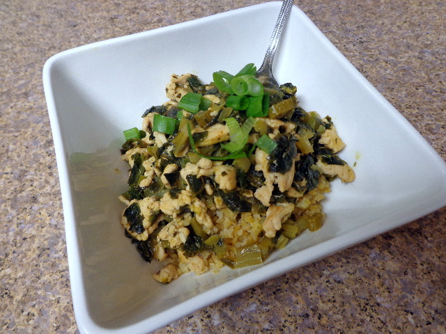 Ground turkey sautéed with garlic, ginger, green onions, and probably something else that I’m forgetting // collard greens and celery cooked in rice vinegar with salt and a bit of sugar (sort of try for the pickled greens served at Pig and Khao) // green curry paste and light coconut milk // served on bulgar.