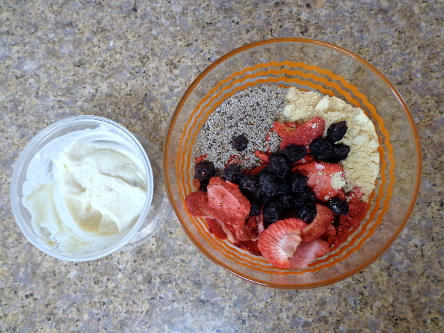 Rolled oats, malted milk powder, chia seeds, freeze-dried strawberries, and dried blueberries. Plus sweetened sour cream on top.