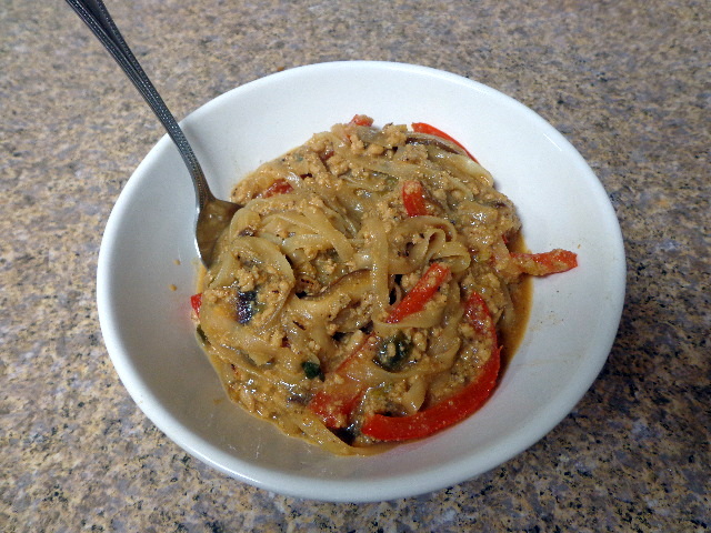 Ground turkey that had been marinated over night with green onions, ginger, garlic, brown sugar, canola oil, fish sauce, soy sauce, rice vinegar, and maple bourbon // baby bok choy, shitake mushrooms, and red bell pepper cooked with Sriracha, ginger, and a pinch of sugar // rice noodles cooked in chicken broth.