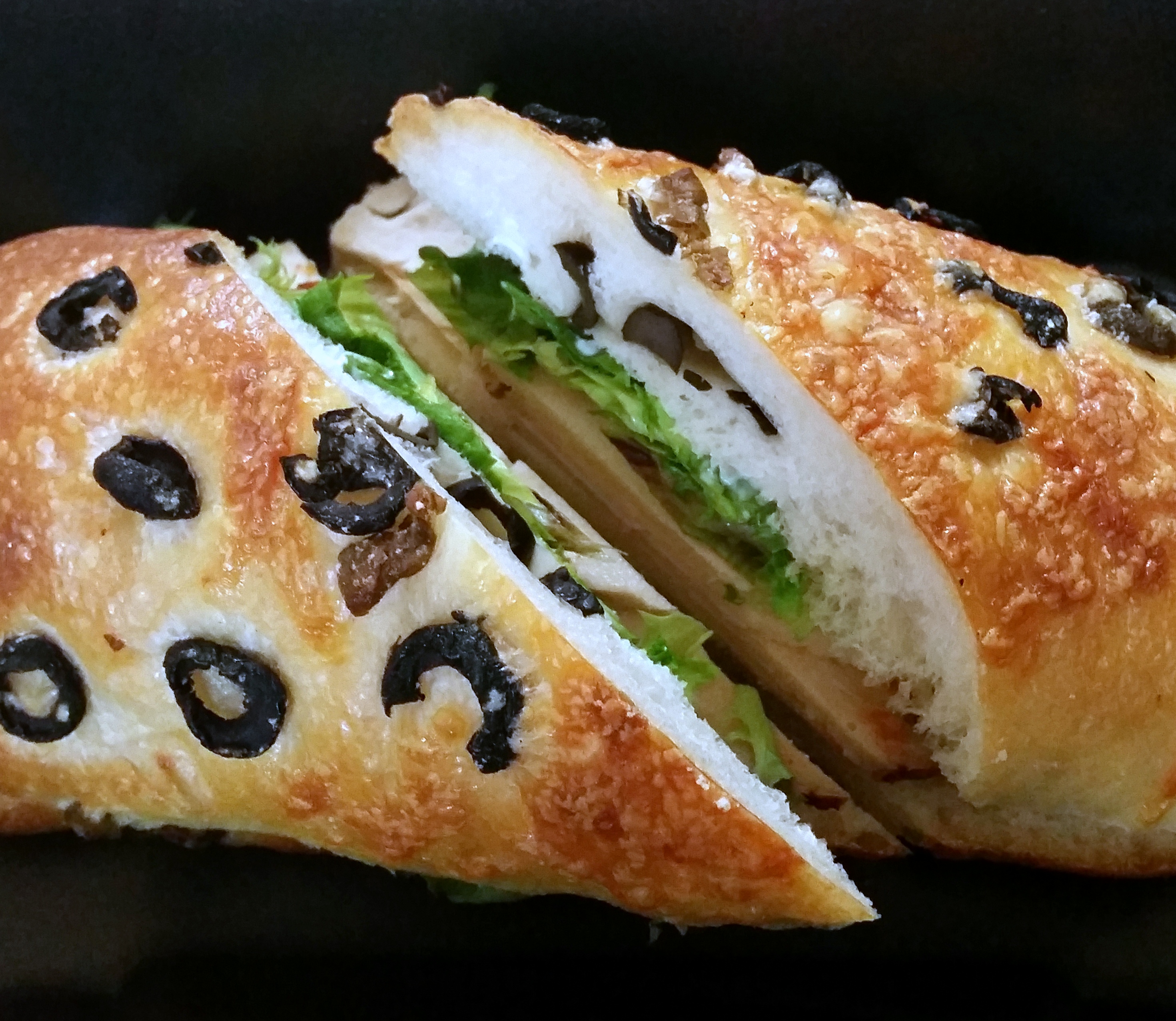 Turkey sandwich from the cafeteria on yummy olive bread.