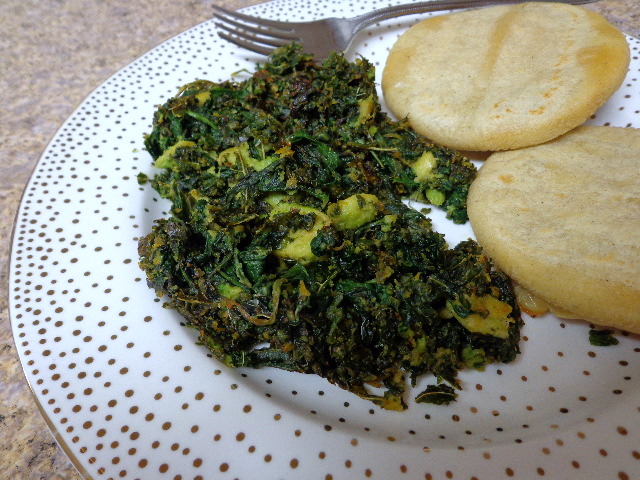 Sautéed arugula tossed with avocado and crumbled kale chips.
