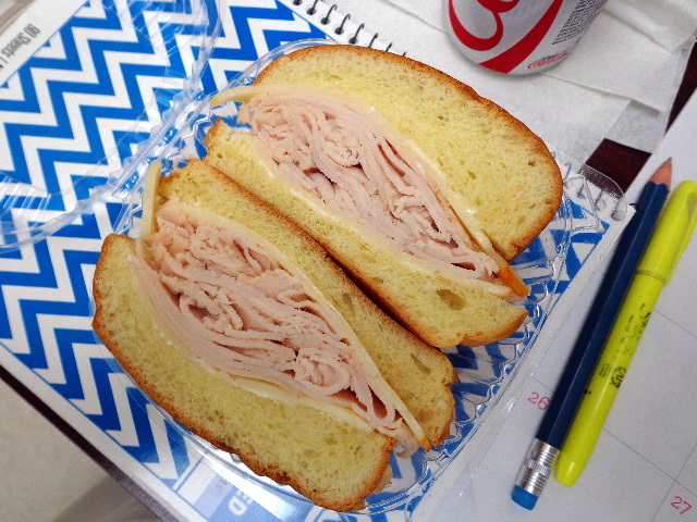 The plainest sandwich ever, also from the cafeteria. Turkey, cheese, and mayo on a white roll. I didn’t even have a fruit, vegetable, or whole grain on the side. I badly sunburned my knees last weekend, long story, and I was feeling a little under the weather that day.