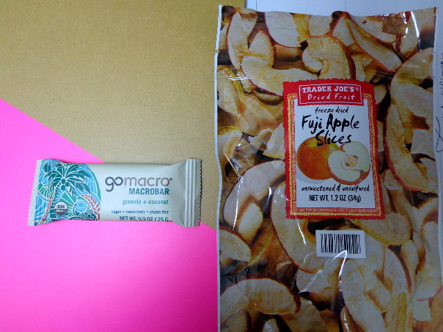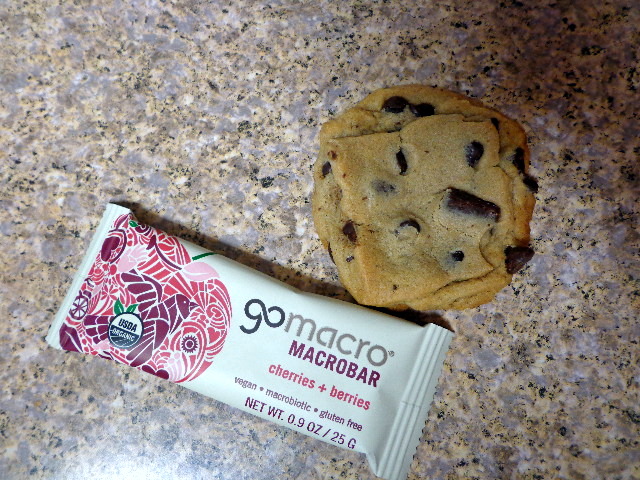 A chocolate chip cookie and a GoMacro cherries + berries (sunny uplift). I was expecting to hate that flavor but it was actually yummy, the cherries were nice and tart and it had some oat texture.