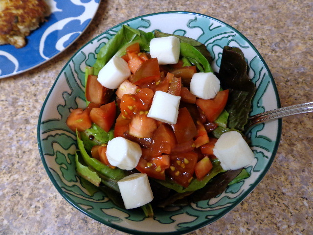 Red and green lettuce mix dressed with truffle salt, evoo, and balsamic vinegar and topped with Kumato tomato and mozzarella.