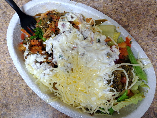 I got salad with peppers and onions, chicken, mild salsa, green salsa, sour cream, and cheese. Plus chips and a giant diet coke on the side. We go to Chipotle so often that the counter staff recognizes us, which is the most embarrassing thing on earth, but we can’t stop!