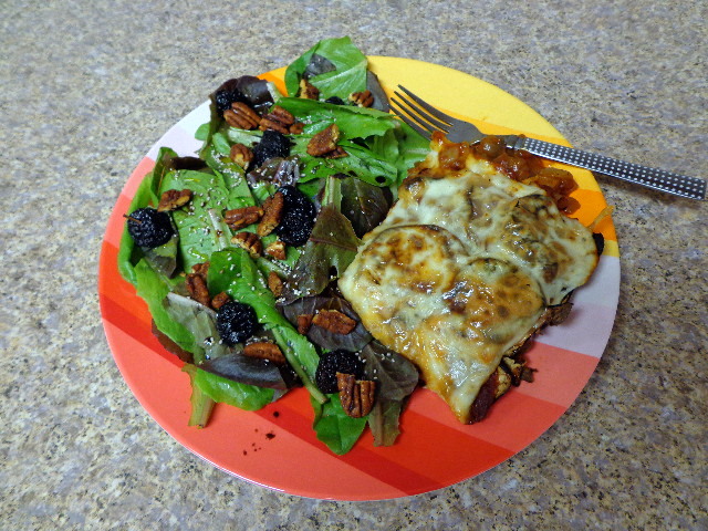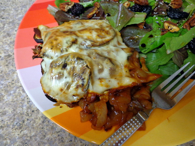 My Cheesy Eggplant Bake with diced yellow onion and light Havarti added in so I could use up some leftovers.