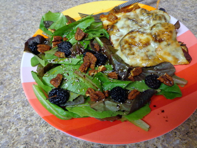 Red and green lettuce // dressed with lavender salt, evoo, honey, and balsamic vinegar // topped with sweet and spicy pecans, dried bing cherries, and chia seeds.