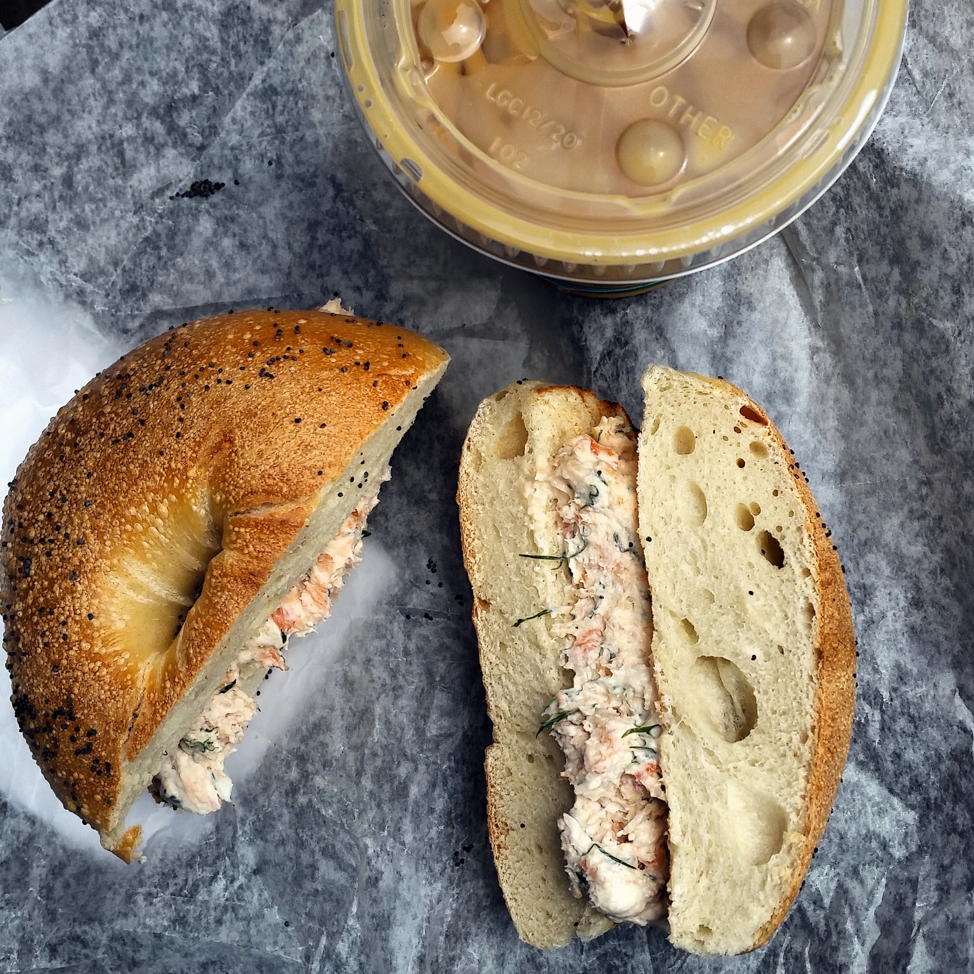 Lunch date at La Bagel Delight. We spit a poppy seed bagel with lox and dill cream cheese.