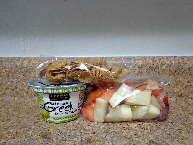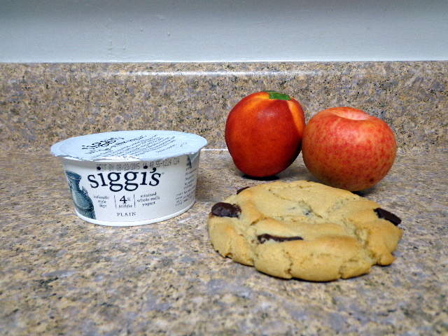 Plain Siggi’s with plucot and yellow nectarine and a giant chocolate chip cookie.