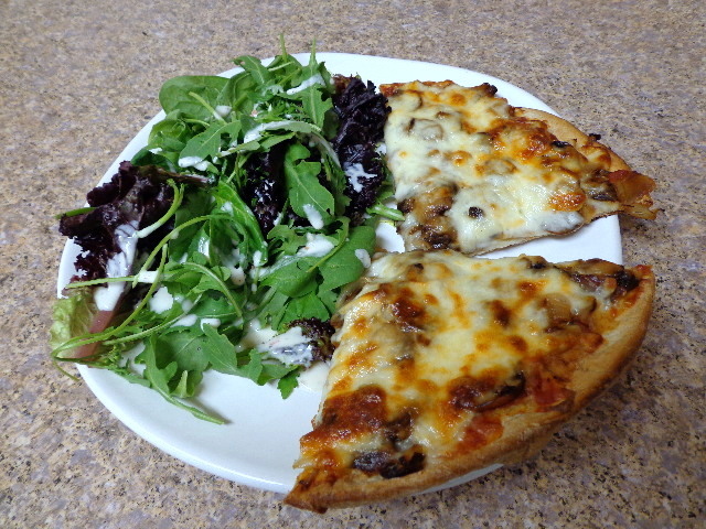 We used TJ’s frozen crusts and were so impressed with how they turned out.  Topped with marinara, mozzarella, and tons of garlic and onion sautéed mushrooms.
