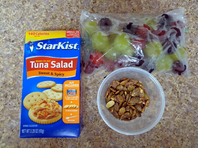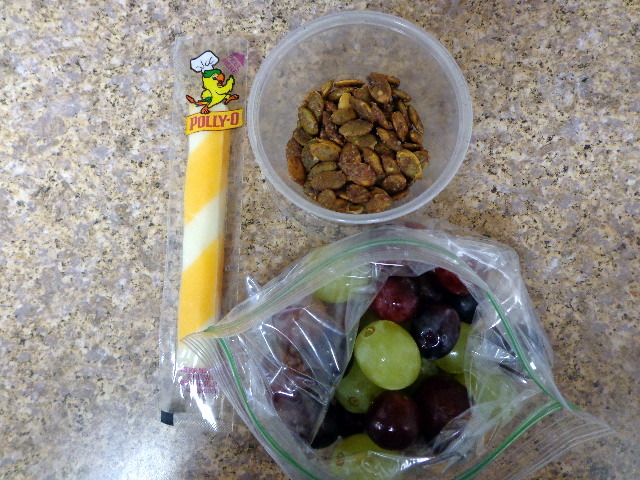 A cheese stick, cinnamon sugar pumpkin seeds, and a medley of grapes.