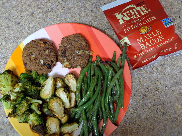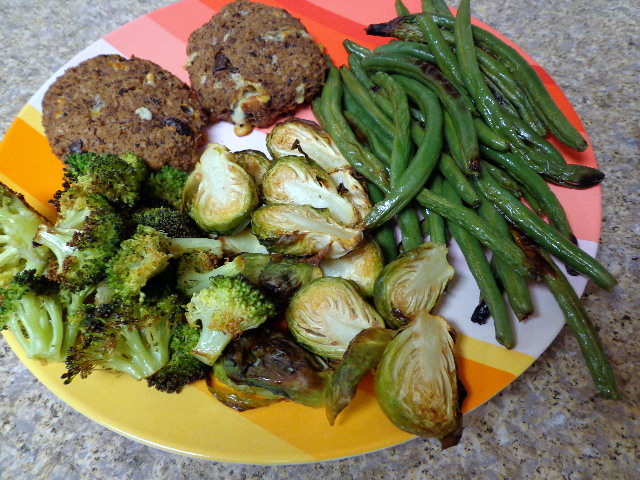 With a trio of roasted veggies: Brussels sprouts, green beans, and broccoli.