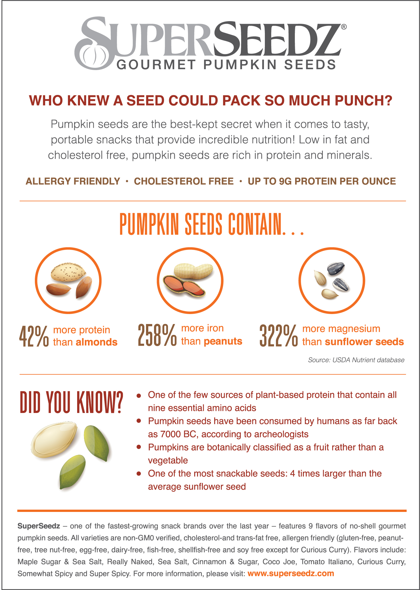 I wouldn’t have thought of pumpkin seeds as a favorite of mine but I’ve loved all of the flavors we’ve tried so far.  Flavor options include: Really Naked, Sea Salt, Cinnamon & Sugar, Coco Joe, Tomato Italiano, Curious Curry, Somewhat Spicy and Super Spicy.  They pack a nutritional punch – see the infographic (provided by the company) below – and Super Seedz are allergen friendly – peanut-free, tree nut-free, egg-free, dairy-free, fish-free, shellfish-free, soy-free and made with gluten-free ingredients.