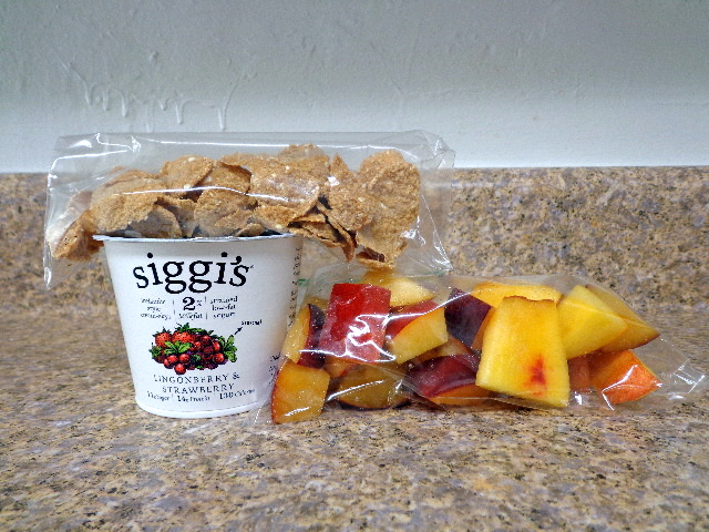 2% Lingonberry Strawberry Siggi’s with chopped apricot and plum and Nature’s Path Heritage Flakes.